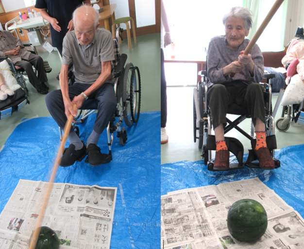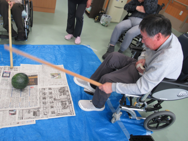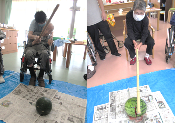 暑い日が続きますが、特別養護老人ホームでは、8月の行事として、スイカ割り大会を行いました。