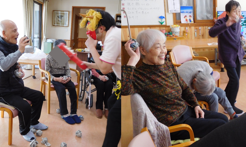利用者様には、豆をまく代わりに新聞紙を丸めた玉を投げていただきました。