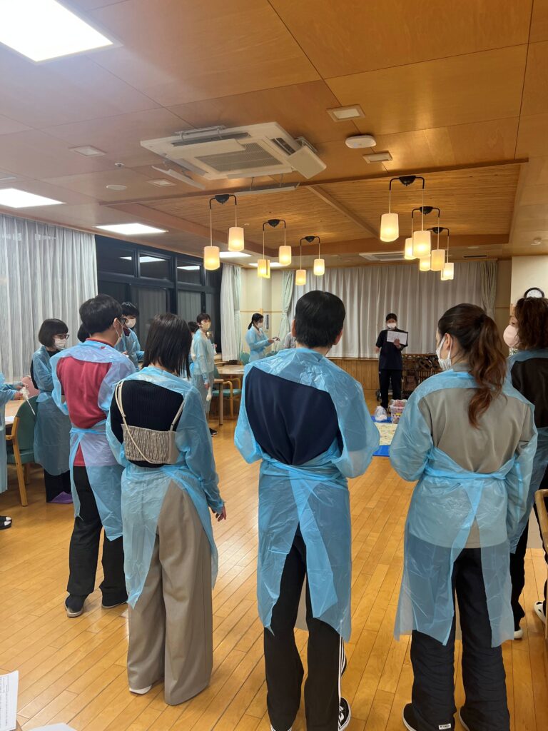 11月に感染症発生をシミュレーションし、ガウンの着方や嘔吐物の処理方法などを確認しました。